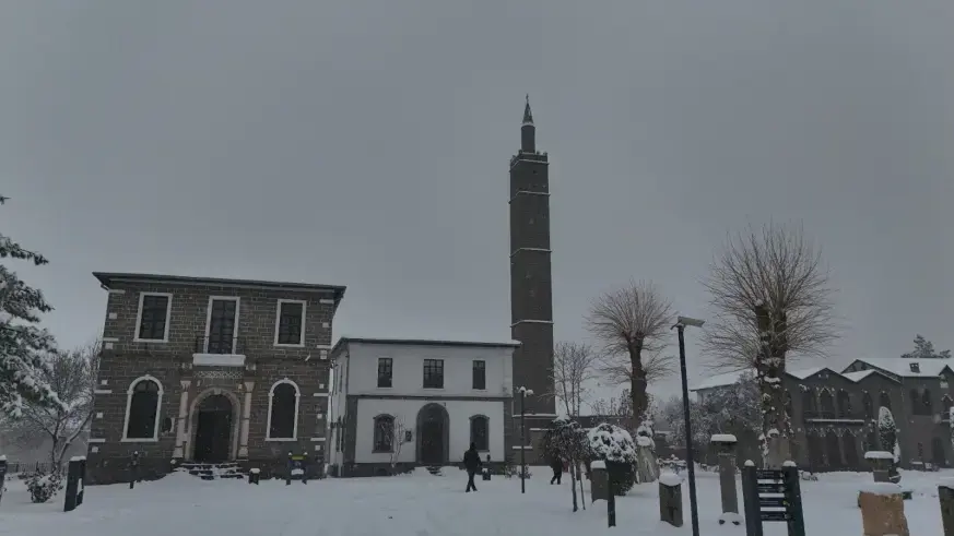 Dünyada 10 bin yıllık tarihiyle en eski ikinci yerleşim yeri olarak bilinen Diyarbakır'ın merkez Sur ilçesi beyaza bürünürken, tarihi yapılar dronla görüntülendi.