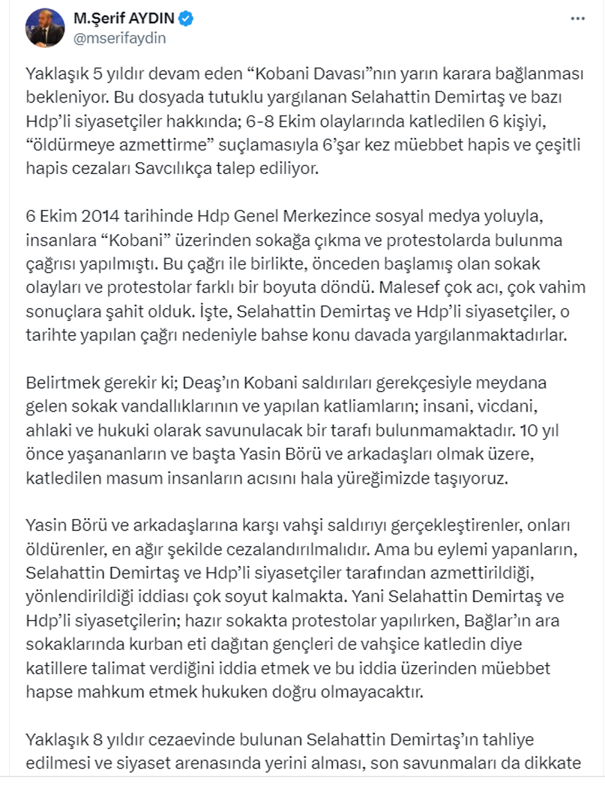 AK Parti Eski İl Başkanı M. Şerif Aydın, yaklaşık 5 yıldır devam eden “Kobani Davası”nın yarın görülecek olan karar duruşması öncesi dikkat çeken bir açıklama yaptı. Aydın, “DEAŞ’ın Kobani saldırıları gerekçesiyle meydana gelen sokak vandallıklarının ve yapılan katliamların; insani, vicdani, ahlaki ve hukuki olarak savunulacak bir tarafı bulunmamaktadır. 10 yıl önce yaşananların ve başta Yasin Börü ve arkadaşları olmak üzere, katledilen masum insanların acısını hala yüreğimizde taşıyoruz” dedi.