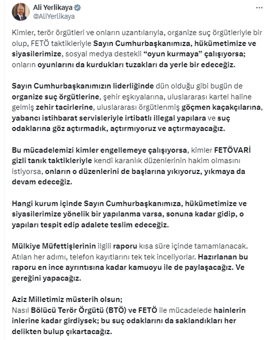 Yerlikaya açıklamasının devamında "Hangi kurum içinde Sayın Cumhurbaşkanımıza, hükümetimize ve siyasilerimize yönelik bir yapılanma varsa, sonuna kadar gidip, o yapıları tespit edip adalete teslim edeceğiz" ifadelerini kullandı.