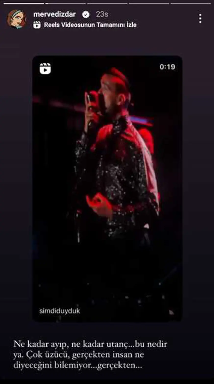 Merve Dizdar, o görüntüleri sosyal medya hesabından paylaşıp; "Ne kadar ayıp, ne kadar utanç... Bu nedir? Çok üzücü, gerçekten insan ne diyeceğini bilemiyor gerçekten..." şeklindeki paylaşımı yaptı.