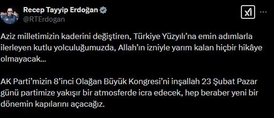 AK Parti’mizin 8’inci Olağan Büyük Kongresi’ni inşallah 23 Şubat Pazar günü partimize yakışır bir atmosferde icra edecek, hep beraber yeni bir dönemin kapılarını açacağız."