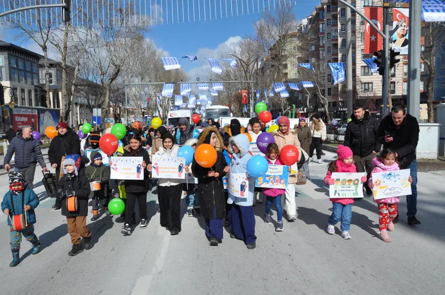 Asra Umut Eğitim ve Yardımlaşma Derneğince düzenlenen etkinlik için dernek yöneticileri, gönüllüler ve çocuklar, Kütahya Belediyesi binası önünde bir araya geldi.