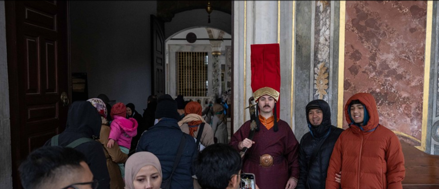 Cumhurbaşkanlığı bünyesindeki Milli Saraylar Başkanlığına bağlı Topkapı Sarayı'nın ziyaretçileri, Osmanlı'da Enderun'un en nüfuzlu siması ve amiri olan silahtarların kıyafetiyle nöbet tutan jandarmalar ile fotoğraf çektiriyor.